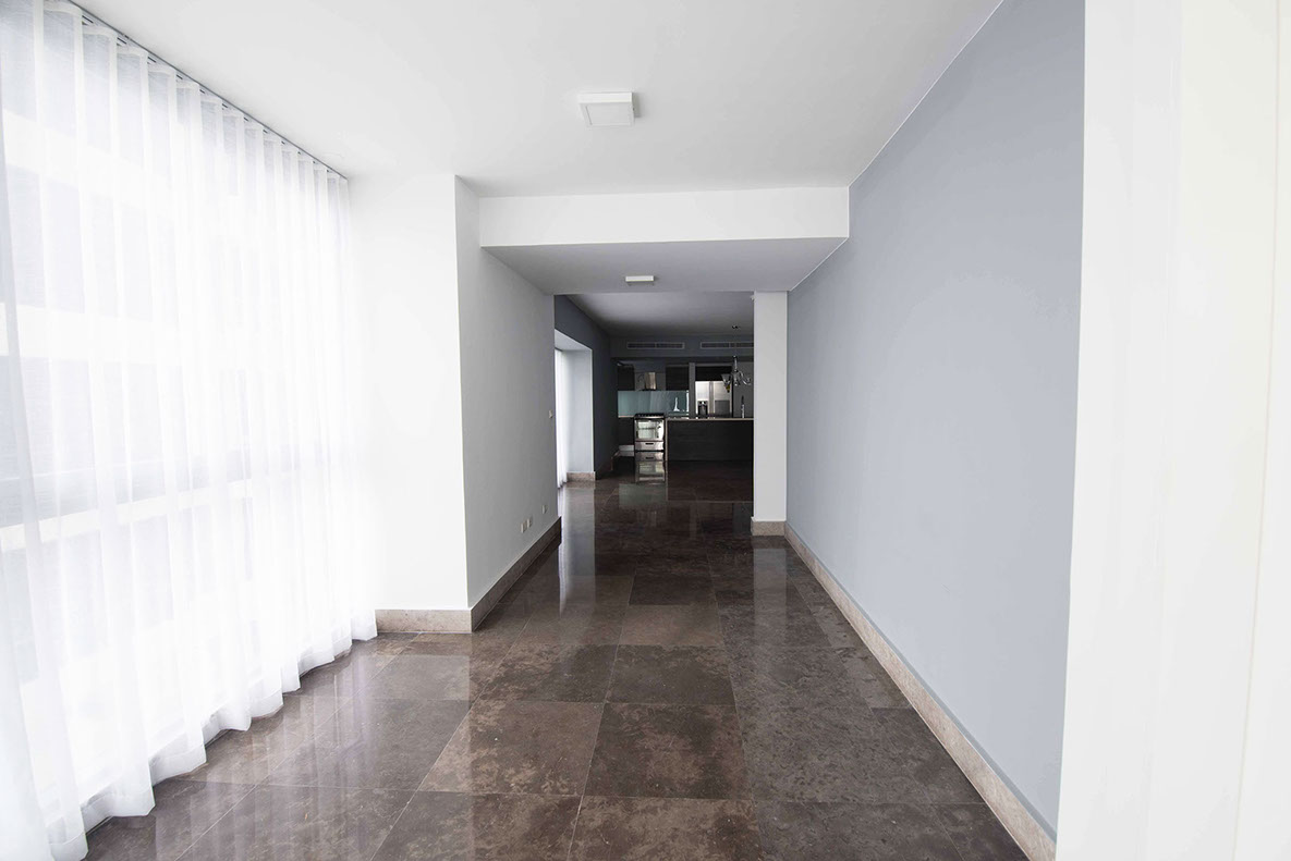 Spacious living and dining room with marble floors.