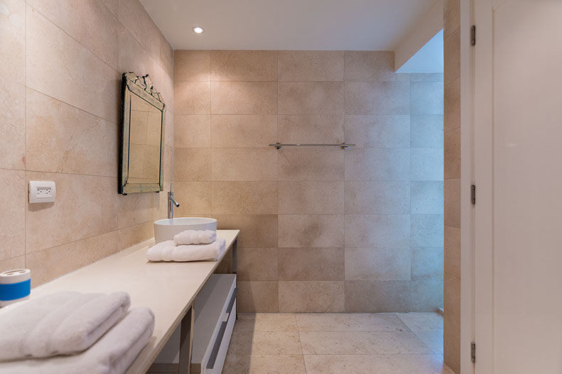 Moderno y exclusivo baño master con azulejos en las paredes y pisos para combinar los materiales de la parte superior del tocador y elegante lavamanos de porcelana.