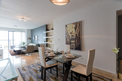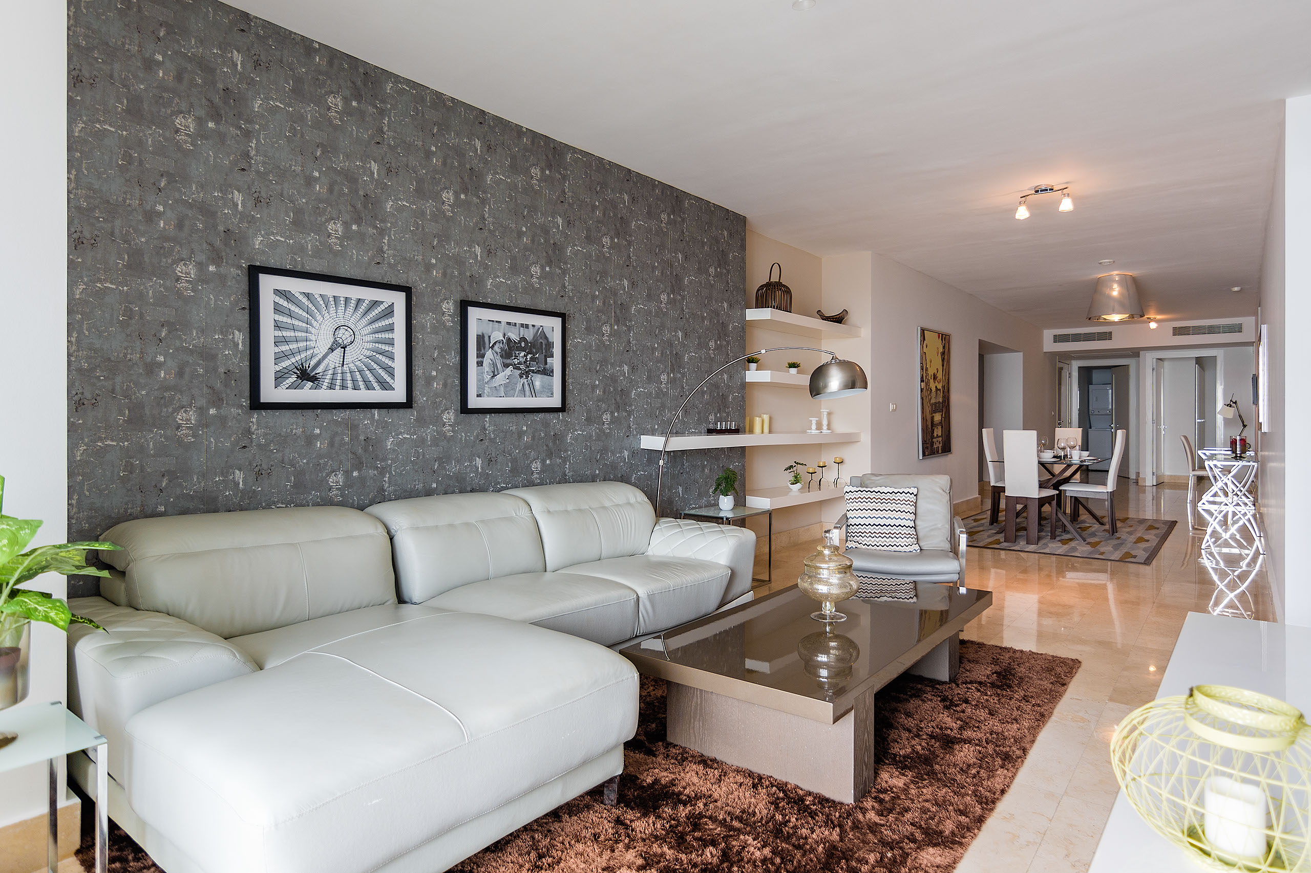 Espaciosa sala y comedor con pisos de mármol.