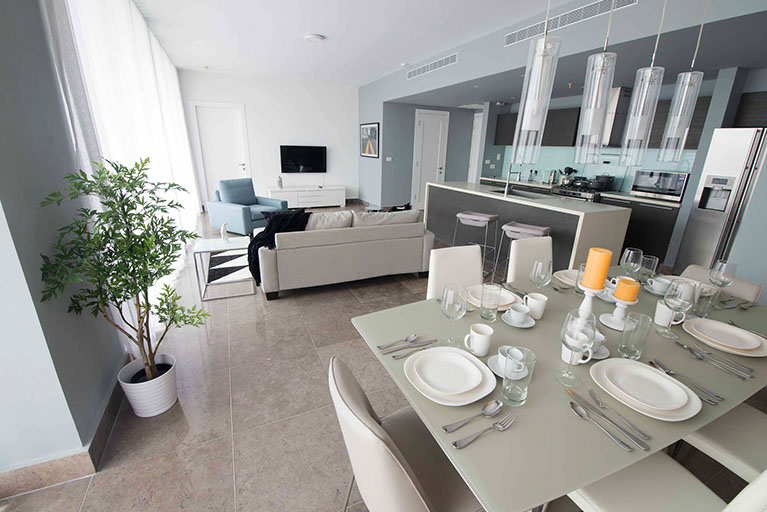 Spacious living and dining room with marble floors.