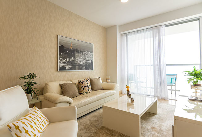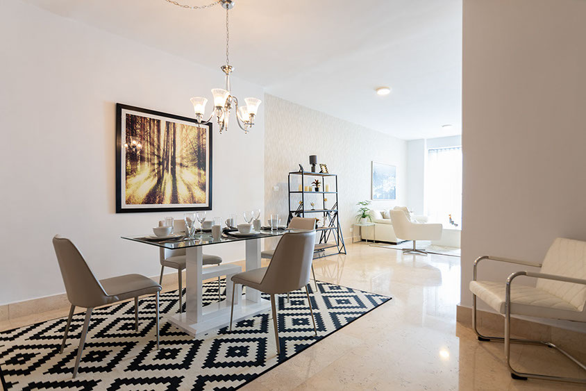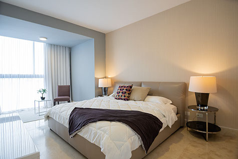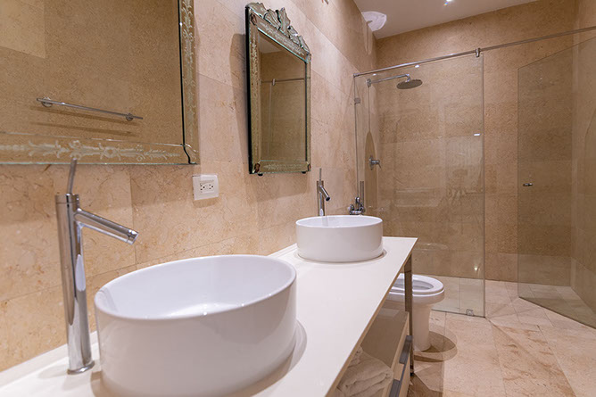 Modern and exclusive master bathroom with modern tiles on walls and floors to match the fine vanity top materials and elegant porcelain sink.