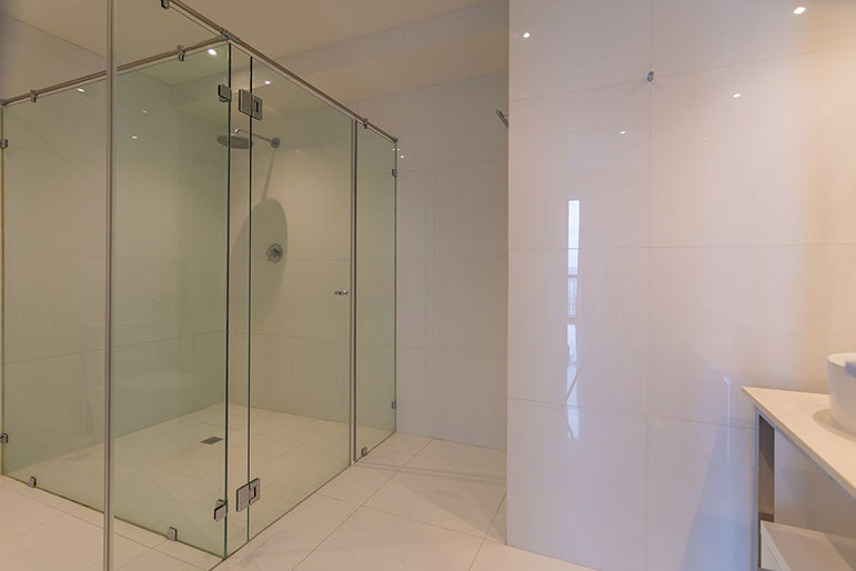 Moderno y exclusivo baño master con azulejos en las paredes y pisos para combinar los materiales de la parte superior del tocador y elegante lavamanos de porcelana.