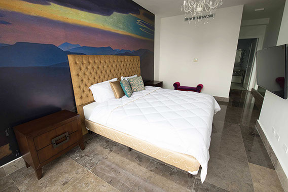 Modern and exclusive master bathroom with modern tiles on walls and floors to match the fine vanity top materials and elegant porcelain sink.